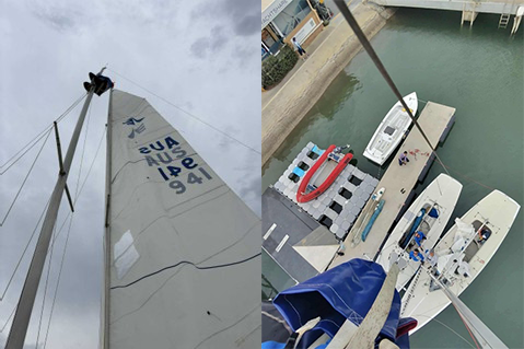 As they fleet headed upwind the approaching storm clouds convinced the RC to abandon the race and send us home for an early beer. Unfortunately for The Saint, they couldn’t get their main halyard to release upon returning to the boat harbour. After much discussion W2 was parked alongside The Saint and Will offered to go up W2s rig in order to reach across and unshackle the halyard from the mainsail. Job done and it was time to take the rig out in order to fix it before this weekend fleet champs. If anyone is looking for advice and assistance in rig removal – tap up Mark T – this was his 5th rig out and back in in 5 weeks!! That must be some sort of record!