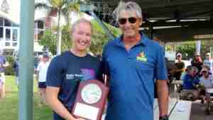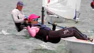 Going into the final heat, Simon had the advantage. The maths had Frances either having to win the last heat or have Simon finish no better than 4th. The first general recall of the regatta eventuated with Simon and Frances locked together, both seeking the advantage. The second attempt started with a little more separation and a drag race to the left. Simon had too much pace and led by 15 seconds at the first mark and Frances in 4th. Frances caught up with Simon on the downwind and blanketed him, with both dropping boats on the second half of the run. Frances rounded the bottom gate in front and covered Simon for the second beat with both boats dropping further places to eventually finish Frances 6th and Simon 9th, Frances taking the regatta by 1 point. Third and fourth place were even closer, with Michael and Christine’s results broken by count back, and Michael ultimately taking third place.